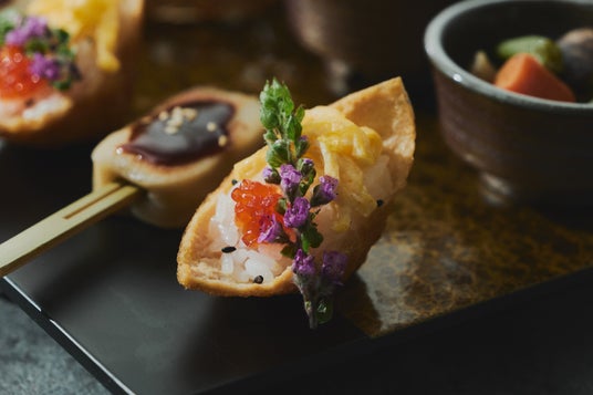 いなりずしを逆さにし、舟に見立てた一品です。いくらと錦糸卵、穂紫蘇で美しく仕上げました。
