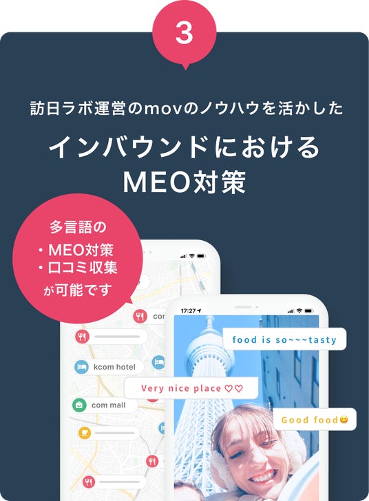 口コミコムではインバウンド対策において重要なGoogleマップや大衆点評ほか海外サイト、自社HPの店舗検索ページを一括で管理・運用できます。また、口コミコムを提供するmovは、業界最大級のインバウンドビジネスメディア「訪日ラボ」を運営しており、その豊富な知見やノウハウを活かしてMEO対策をご支援します。