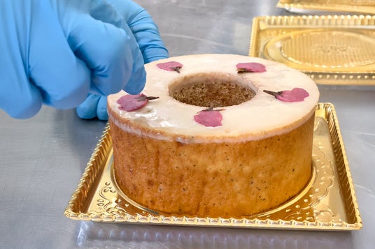 最後に、バウムの頂点へ桜の花の塩漬けを添えます。機械では不可能な、花びらの開き具合までこだわった配置。手で一枚一枚、心を込めて乗せていくこの瞬間、バウムクーヘンは「一輪の桜」へと昇華します。