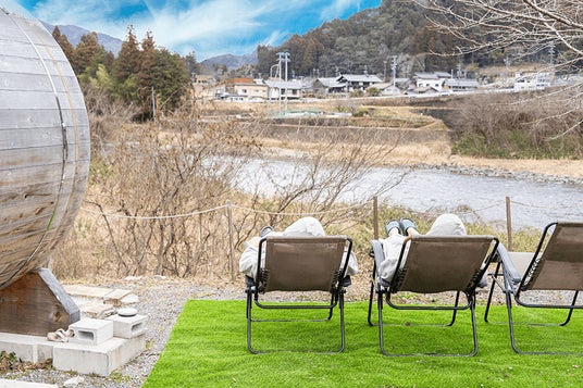 敷地内にはテントサウナやバレルサウナも完備。(有料)じっくりと体を温めた後は、すぐそばを流れる清流へ。広大な長良川をまるで天然の水風呂のように楽しめる、ここでしか体験できない“ととのい時間”をご堪能いただけます。
