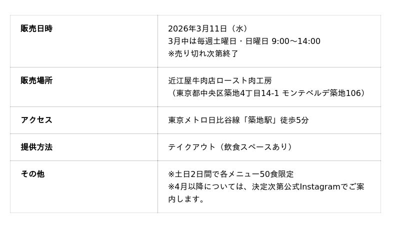 近江屋牛肉店ロースト肉工房を手掛ける近江屋牛肉店(東京都中央区築地、代表:寺出昌弘)は、先日発表した2024年ハンバーガー日本大会優勝店「ハリーズ・ジャンクション」との特別コラボレーションとして、本日3月11日(水)より限定メニュー「築地100年バーガー」を含む2種のハンバーガーの販売を開始します。