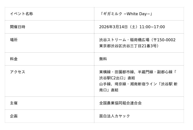 「ニッポンエールプロジェクト協議会」は、「日本全国47都道府県から届けられる日本産のたべものに、そしてにっぽんにここからエールをおくろう」というコンセプトのもと、JA全農とメーカー、販売先が協力して国産農畜産物のPRやキャンペーン等を展開し、商品を通して産地を応援する活動です。2023年1月の開始以来、第7弾となる2026年は「『北海道酪農応援』~牛乳・乳製品の消費拡大~」をテーマに掲げています。本イベント「ギガミルク -White Day-」は、学乳(学校給食用の牛乳)が休止する春休みを前に、消費促進を目的として実施されます。メインスポットとなる全長約12メートルの巨大牛乳パックは、「牛1頭が1年間に出す牛乳の量=8,000L」を可視化したものです。毎日搾乳を続ける酪農家の方々の努力と、命の恵みの大きさを体感できる仕掛けとなっています。