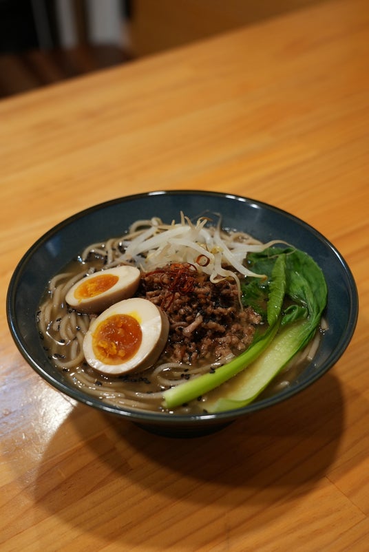 3. お皿に盛り付け、肉味噌・青菜・白髪ネギ・煮卵・もやしを盛る