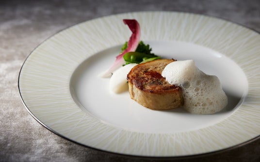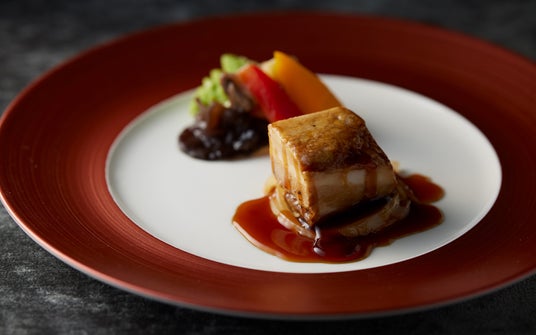 大葉のピューレとサフランマヨネーズ秋田県産比内地鶏を蒸し焼きにし、しっとりとした食感のガランティーヌに仕立てました。 甘みのあるルビーポルト酒のジュレを下に敷き、大葉のピューレとサフランマヨネーズを周囲に配し、香りと彩りのアクセントにしています。