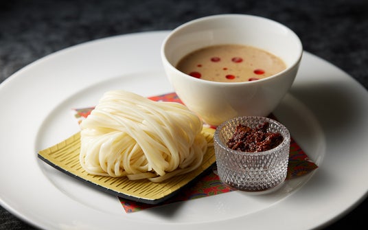 稲庭うどんを使った坦々つけ麺秋田の稲庭うどんを、坦々つけ麺に仕立てにしました。