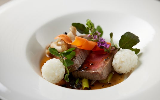 比内地鶏の旨みをいかしたソースにトリュフの香りを添え、秋田の郷土料理「だまこ鍋」をイメージした、だまこもちとともに仕上げています。