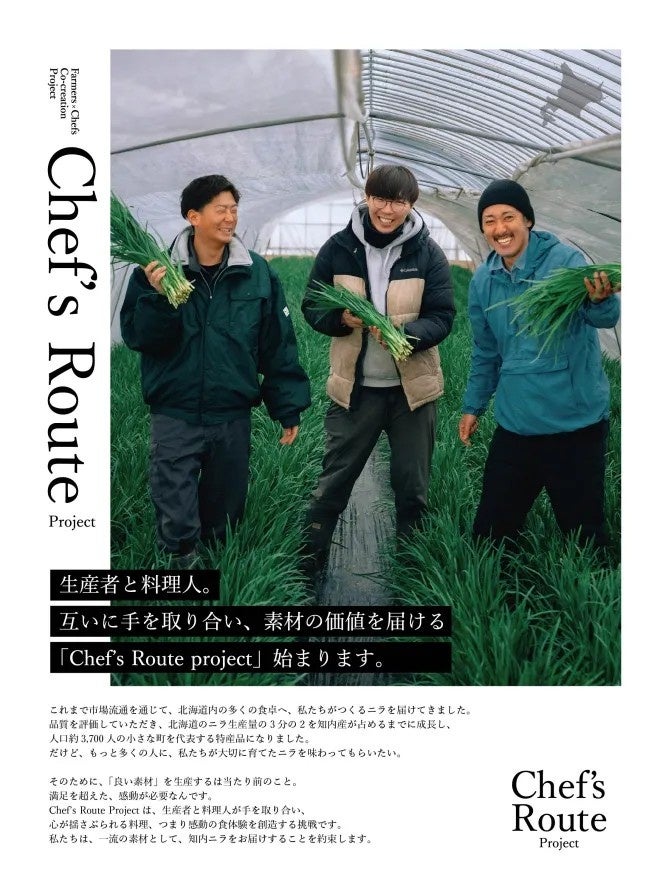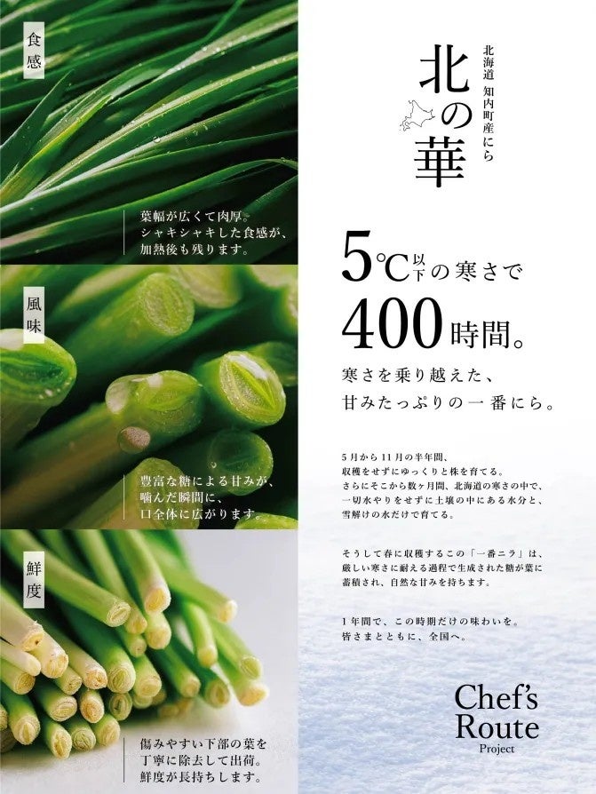 ・上記のような課題解決のきっかけとして、知内商事は知内の「一番ニラ」を特に地域外の料理人の方に知っていただくために、「北の華」の飲食店及び個人の方向けのEC販売として「Chef's Route Project」をスタートします。