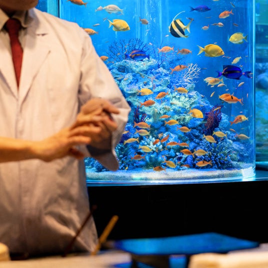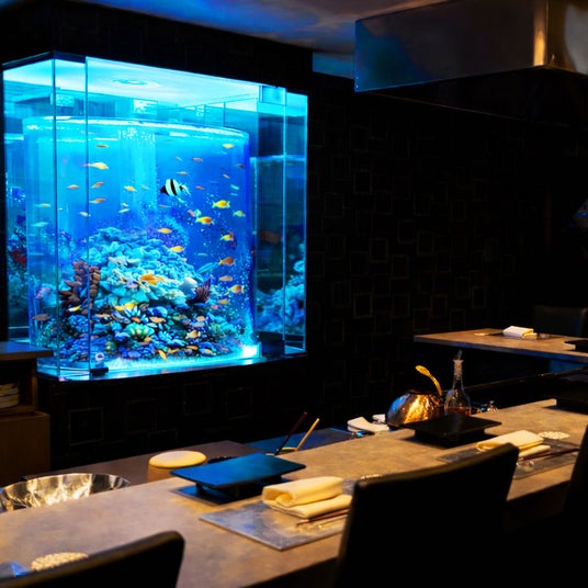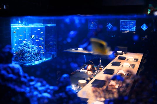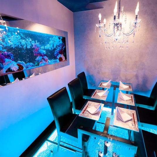 店内の大きな特徴は、幻想的なアクアリウムの水景。蒼く揺らめく水の世界に包まれながら、職人の技と厳選食材が織りなす料理を堪能できる、日本でも類を見ない美食体験を提供します。