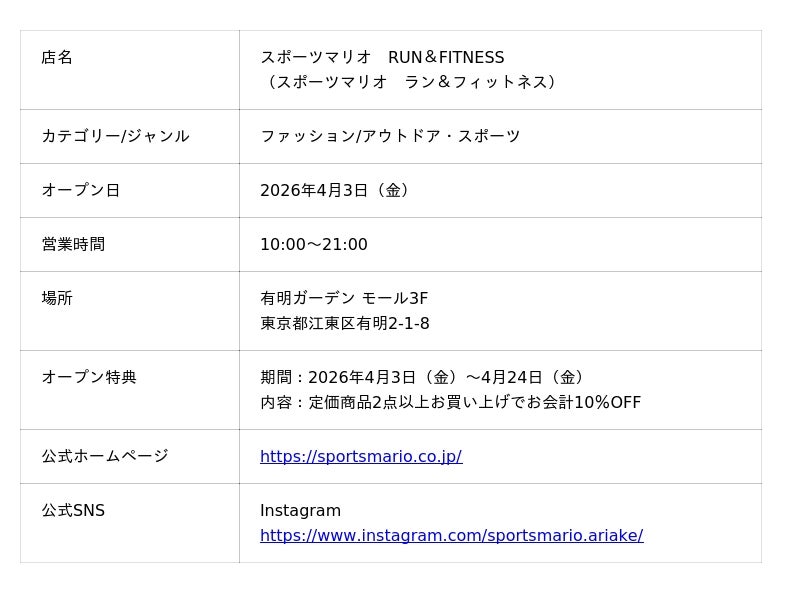 ■スポーツマリオ RUN&FITNESSスポーツマリオ RUN&FITNESSは、スポーツとアウトドアを融合したセレクトショップです。THE NORTH FACE、On、HOKAなどの人気ブランドのシューズやアパレルを厳選し、機能性とデザイン性を兼ね備えた商品を展開します。専門スタッフが初心者から上級者まで幅広いお客様のニーズに寄り添い、アクティブなライフスタイルをサポート。都市生活者の日常に新たな体験を提案します。