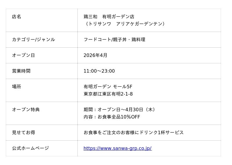 ■鶏三和 有明ガーデン店|4月オープン