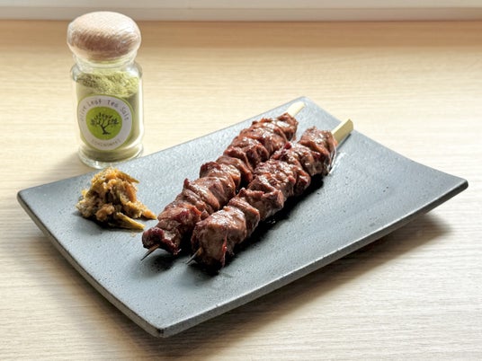 石巻と女川の恵みから生まれた、オリーブ茶ソルトは、一般的な抹茶塩のように香りが前面に出るタイプとは異なり、塩そのものの旨味と存在感をしっかりと感じられるのが特長です。ほのかに立ち上がるのは、緑茶の茶葉を思わせるやさしい香り。牛たんの脂の余韻を引き締めながら、後味をすっと整えます。けやきでは、牛たん焼きにつけるだけでなく、ジューシーな牛たん串に軽く振りかけたり、テールスープに少量加えたりと、さまざまな楽しみ方を提案します。料理の仕上げにひと振りすることで、素材の旨味に新しい表情をもたらします。