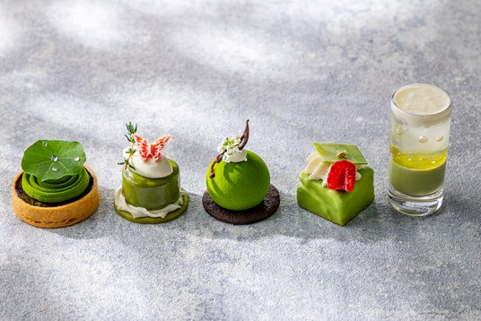 (写真左より)抹茶とチョコレートのタルト ローズマリーの香り、抹茶とレモングラスのチーズケーキ ジャスミンとミントクリーム、抹茶ムース いちごとバジルのジュレ、抹茶のケーキ ジンジャーレモン、抹茶とティムールベリーのジュレ ココナッツソースとアロエ