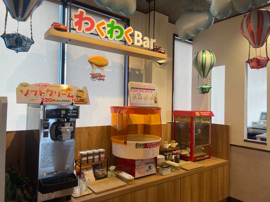 わたあめ、ポップコーンはどなたさまも無料でお楽しみいただけます!自分で作れて楽しい。「わくわくバー」新登場!ソフトクリーム、わたあめ、ポップコーンを「わくわく」がとまらない豊富なトッピングでお楽しみいただける体験型のコーナーです。お子様はもちろん、大人も楽しめる新しい魅力。のんべぇの方も無料のポップコーンをアテにしてビールもガンガンいけちゃうかも!?