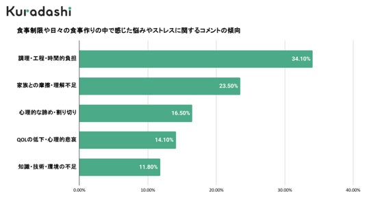 アンケートの結果、回答者の半数以上が「1日1時間以上」の負担増を感じていることが分かりました。食事制限は1日も休むことができません。1日わずか1時間の差であっても、1年に換算すれば365時間、日数にして約15日間分を食事管理のみに費やしていることになります。徹底した計量や、家族と別メニューを作る「ダブル調理」の手間は、生活の質(QOL)を圧迫する大きな要因となっていることが分かります。