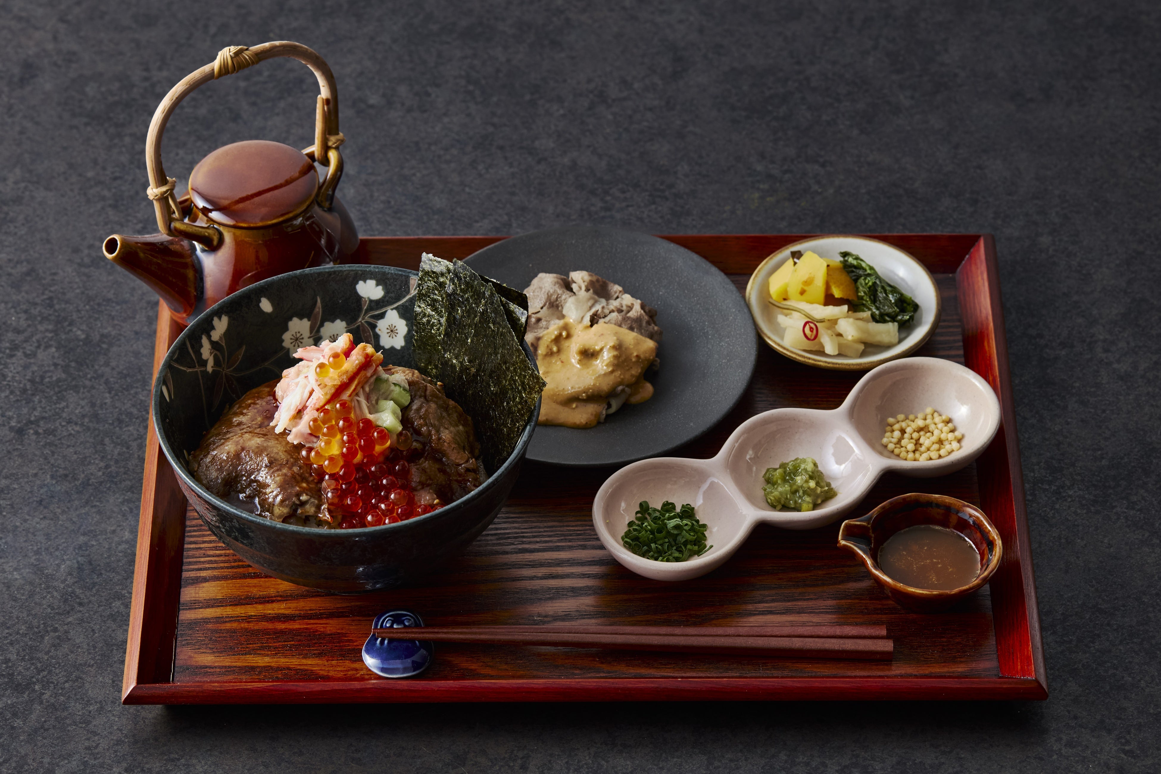 香ばしく焼き上げた極上の黒毛和牛すき焼きと、吟味した海の幸の数々を、炊き立てのご飯へ贅沢に盛り付けた逸品です。口の中でとろけるような味わいの黒毛和牛すき焼き肉。濃厚な旨みのネギトロ、新鮮な甘みが広がる蟹、ぷちっと弾けるいくら。