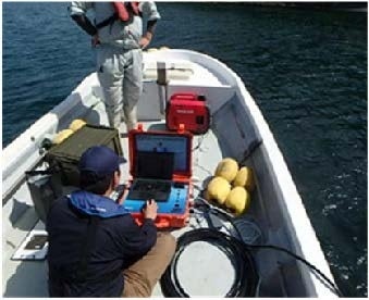 対象海域では2000年頃より、地域の方々が中心となって、食害生物であるウニ類の駆除活動を行ってきたことで、近年は小型褐藻類の繁茂が確認されています。新上五島地区藻場再生・保全活動組織の組成以降、東陽テクニカは、E-SYSTEMと連携し、新上五島町に面する対象海域における藻場の再生状況を定期的にモニタリングすることで、藻場再生活動を支援しています。2025年3月の認証対象期間では、魚類も含む海洋調査に用いられるポータブル・デジタル計量科学魚群探知機「DT-X Extreme Echosounder」を使用しましたが、今回の認証対象期間では、より作業負担を抑えられるポータブル底質判別・植生探査ソナー「MX」を用いて藻場の計測を実施しました。