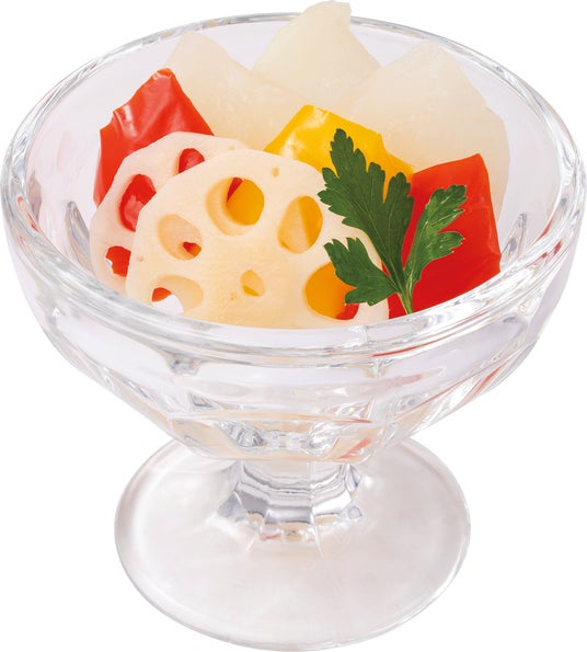 大根、パプリカ、レンコンを酢漬けにした一品です。春夏にぴったりのさっぱりと爽やかな味わいの前菜に仕上げました。