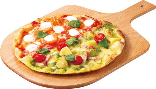 プレミアムマルゲリータと爽やかな味わいのジェノベーゼの2種類の味が楽しめるピッツァです。