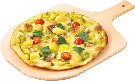 バジル、ミニトマト、ポテト、ベーコンを使用した爽やかなバジルの香りをお楽しみいただけるピッツァです。