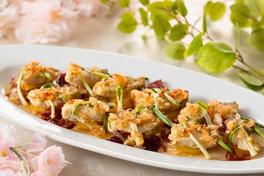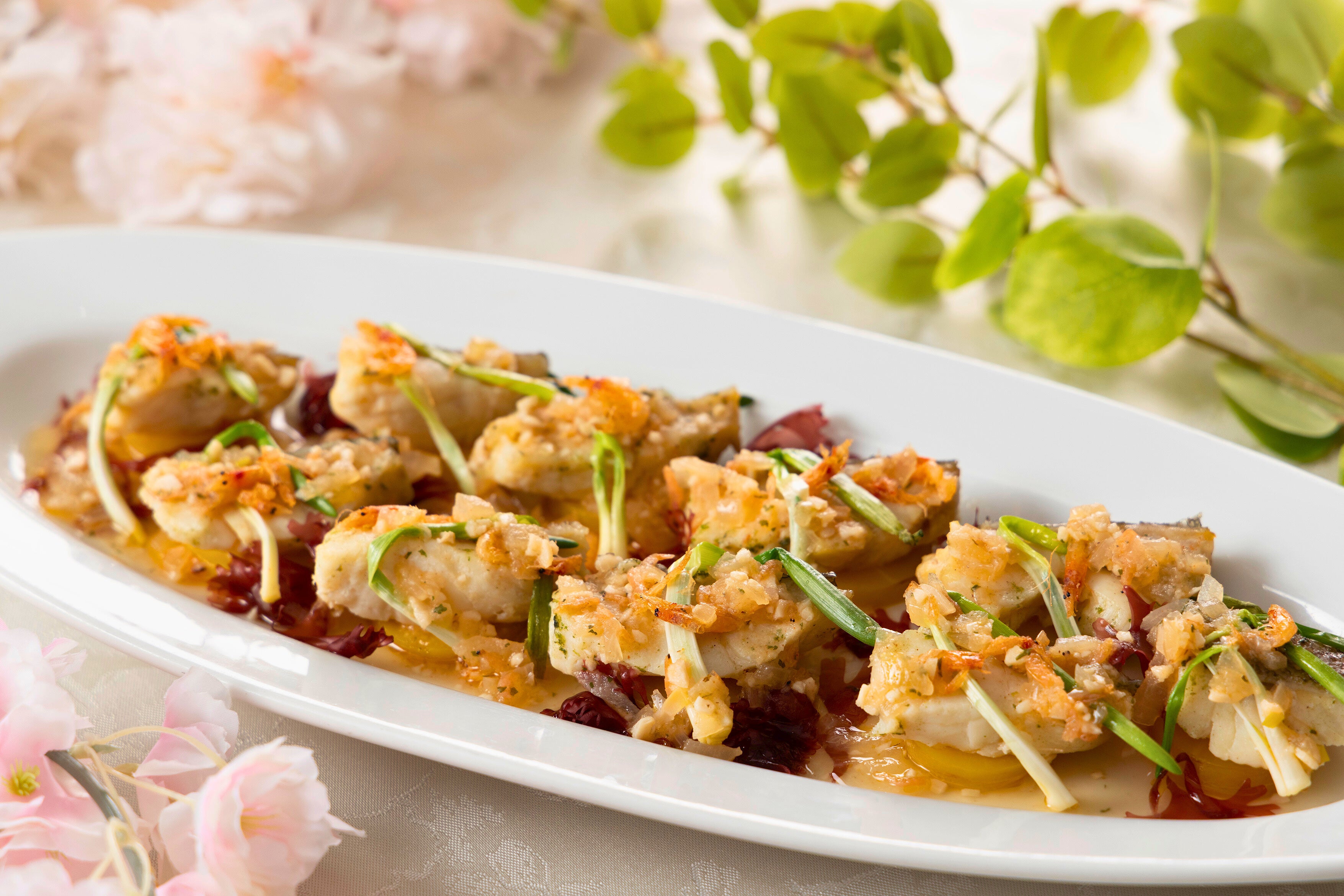 ふっくらと蒸し上げた白身魚に、桜エビの旨味を凝縮した香り豊かなソースを合わせました。