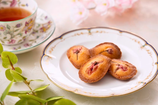 甘さ控えめのマドレーヌに桜の花びらを添えました。