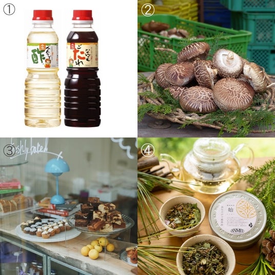 1.香美町「トキワ」べんりで酢、なんでもごたれ、2.猪名川町「仲しい茸園」原木しいたけ ※3/21(土)のみ、3.豊岡市「TAS」※3/21(土)・22(日)のみ、4.香美町「森林浴茶」※3/21(土)・22(日)のみ※画像はイメージです。
