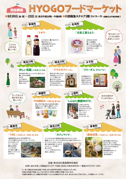 兵庫県は大きく、関西にお住まいの方にもまだ知られていない魅力がたくさん詰まった県。そんな兵庫県の中の3つの町にスポットをあて、現地の方や生産者と直接触れ合うことができる、地域の魅力発見イベント「HYOGOローカルマルシェ」を川西阪急スクエアにて初開催いたします。ふるさと納税の人気返礼品を実際に試して購入できるコーナーや、人気のゆるキャラも登場!地元だけど意外と知らない…そんな兵庫の魅力に触れることのできるイベントです。