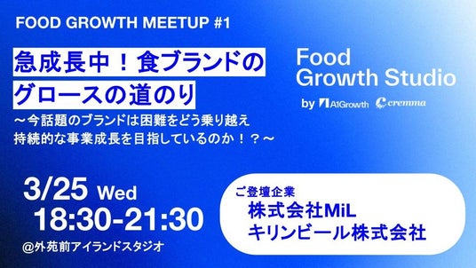 株式会社Cremma(本社:東京都世田谷区、代表取締役:安森啓)と株式会社A1Growth(本社:東京都世田谷区、代表取締役:堀田遼人)が共同で運営する食品領域特化ユニット「Food Growth Studio(フードグローススタジオ)」は、食ブランドのグロースに携わる実務者向けミートアップ「Food Growth Meetup #1」を2026年3月25日(水)に開催します。