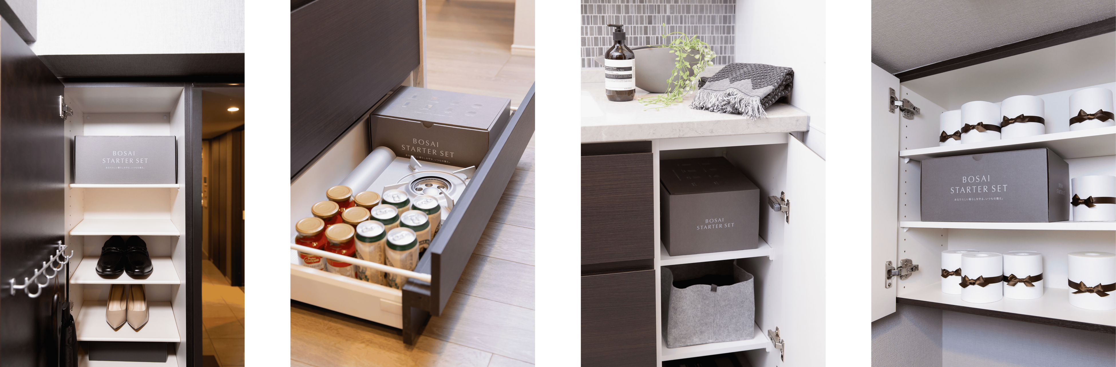 玄関収納やキッチン巾木収納など、住戸内のさまざまな場所に収まるサイズ設計。必要時にすぐ取り出せる配置が可能です。