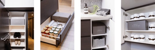 収納の参考例:(左写真から)玄関収納、キッチン巾木収納、洗面収納、トイレ吊戸棚収納