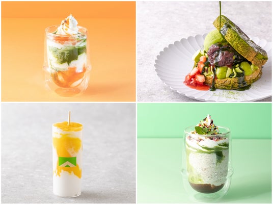 左上:MATCHAハニーメロン 右上:MATCHAフレンチトースト季節のフルーツ添え 左下:MOCHIスティックマンゴーチーズ(鎌倉店)右下:MATCHAチョコミント