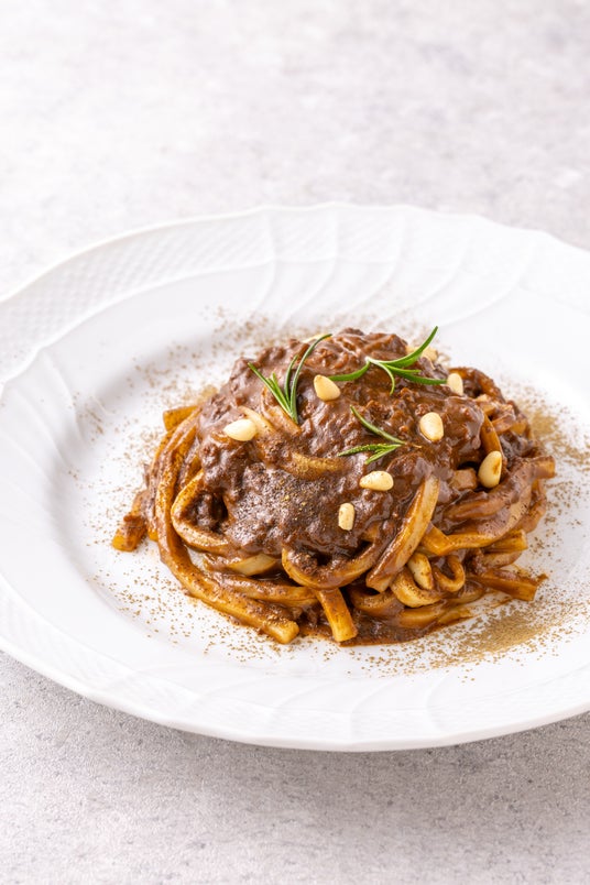 定番のミートソースパスタ、ボロネーゼをほうじ茶でアレンジしたパスタ風うどんです。濃厚なボロネーゼソースに香ばしいほうじ茶パウダーをプラス、ソースのコクが増してより香ばしく奥の深い味わいが生まれます、完成したパスタの上にさらにほうじ茶ソースをトッピング、香りのアクセントにローズマリーと松の実を加えて完成です。もちもちのうどんとほうじ茶のボロネーゼソース。他では味わえないパスタ風うどん、ぜひランチの際にお試しください。MATCHAカルボナーラうどんとの食べ比べもおすすめです!