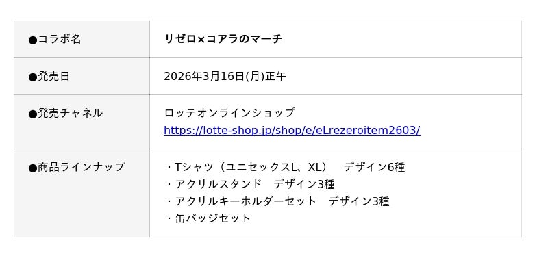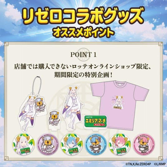 株式会社ロッテ(東京都新宿区、代表取締役社長執行役員:中島英樹)は3月16日(月)正午に、ロッテオンラインショップ限定でTVアニメ『Re:ゼロから始める異世界生活』と『コアラのマーチ』のコアラたちがコラボした特別グッズを4種類販売いたします。作品のキャラクターたちがコアラの耳をつけてかわいく大変身。さらに、各キャラクターをモチーフにしたコアラたちも登場します。ロッテオンラインショップにて、期間限定・受注生産となります。ぜひ詳細をご覧ください!