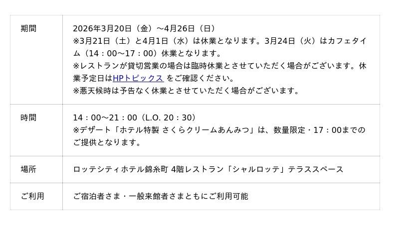ロッテシティホテル錦?町(所在地:東京都墨田区錦?4-6-1 総支配人:福井朋也)は、2026年3月20日(金)~4月26日(日)の期間限定で、ホテル4階レストラン「シャルロッテ」テラススペースにて、春の季節限定「SAKURA Terrace Cafe & Bar (サクラテラス カフェ&バー)」をオープンいたします。