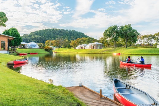 滋賀県米原市にある県内最大級の大型グランピング施設。滋賀県最高峰の伊吹山が見える眺望や大きな池でカヌーを楽しめるロケーションの中で本格的なグランピン グ料理が味わえます。リゾート感あふれるドリンクを提供するバーテラスやラウンジを中心に、池の周りに配した客室棟は全18棟。夜の美しい夜景も人気があります。