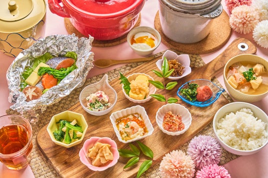 和洋 選べる朝食メニュー「春の和食」 地域野菜も使用して多くの品数をご用意しています。