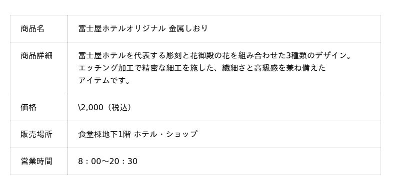 国際興業グループの富士屋ホテル株式会社(本社/神奈川県足柄下郡箱根町宮ノ下359/代表取締役 社長 安藤 昭)では富士屋ホテル(神奈川県足柄下郡箱根町宮ノ下359/取締役 総支配人 飯田 慶)のホテル・ショップにて、館内の建築意匠をモチーフにしたオリジナル金属しおりを発売いたしました。