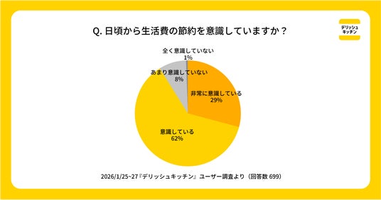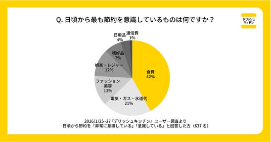 『デリッシュキッチン』のユーザーを対象とした意識調査の結果、91%が「日頃から生活費の節約を意識している」(非常に意識している:29%、意識している:62%)と回答。最も節約を意識している項目としては、「食費」が42%で最多となりました。