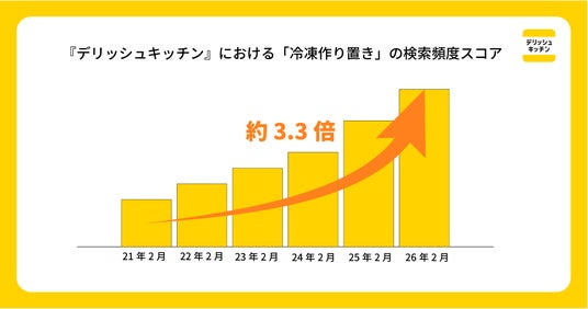 近年、食費の節約や時短を両立できる「冷凍作り置き」への注目が集まっています。『デリッシュキッチン』では、2026年2月の検索頻度が、2021年2月と比較し約3.3倍に増加しました。