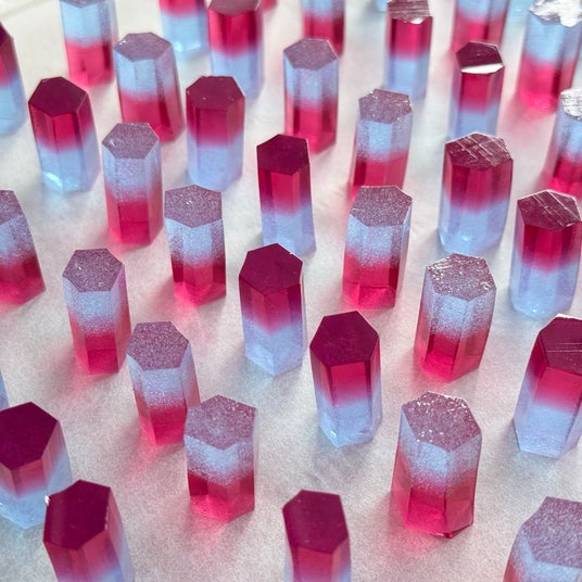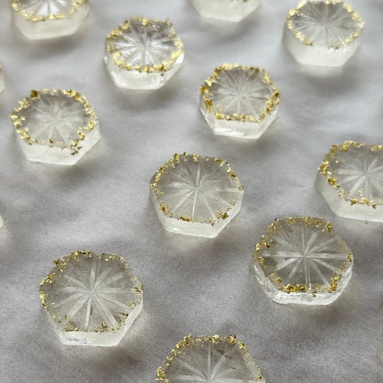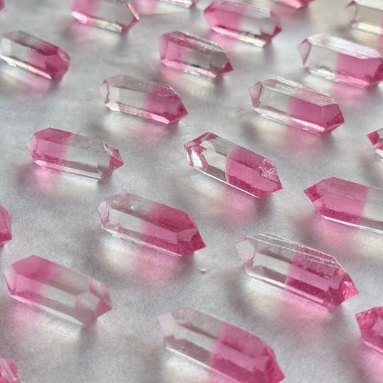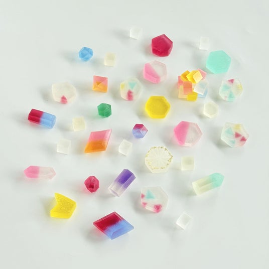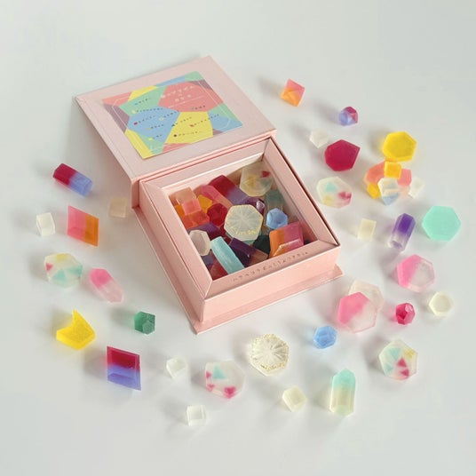 ハラペコラボの「こうぶつヲカシ」は、鉱物や宝石の美しさを和菓子で表現したオリジナルの琥珀糖。職人がひとつひとつ手作業で形づくるため、すべて形や色合いが異なり、まるで本物の鉱物のような個性を楽しむことができます。