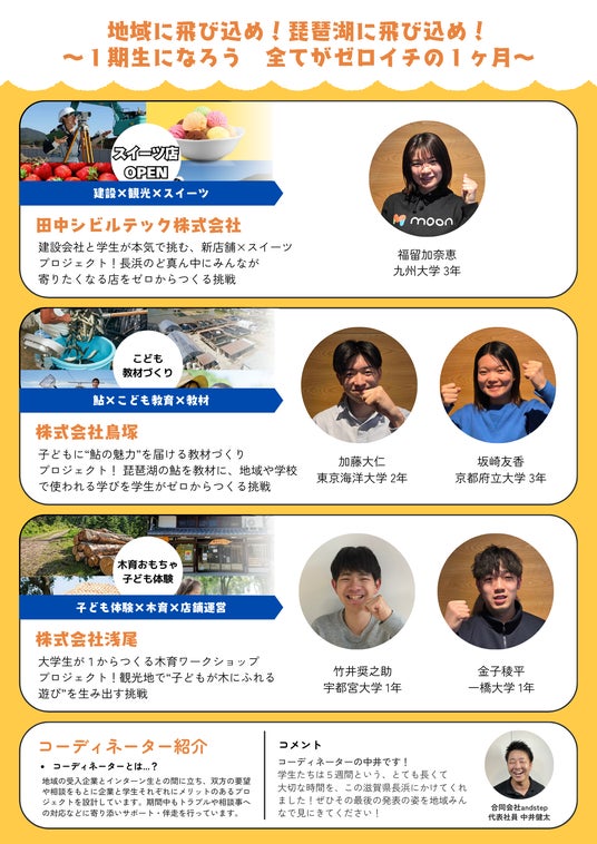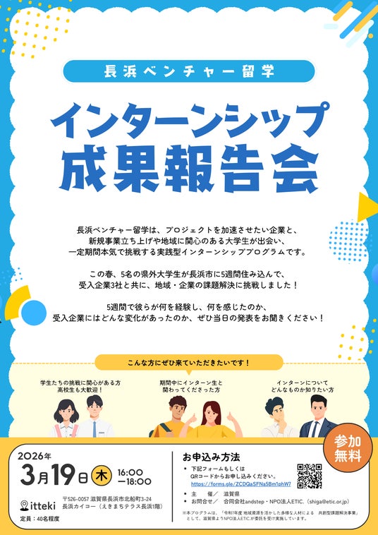 NPO法人ETIC.(エティック、東京都渋谷区)は、滋賀県より委託を受けた「令和7年度 地域資源を活かした多様な人材による共創型課題解決事業」の一環として、地域課題の解決を牽引する「地域コーディネーター」の育成を行っています。このたび、長浜市で活動するコーディネーター・中井健太氏(合同会社andstep)の実践の機会として、大学生が地域企業と新規事業に挑む実践型インターンシップ「長浜ベンチャー留学」を実施いたしました。5週間にわたるプロジェクトの成果を発表する報告会を、2026年3月19日(木)に長浜市内で開催します。