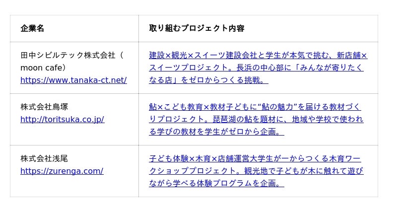 人口減少や若者流出が進む地域では、地域企業の担い手不足や、新しい事業に挑戦するための人材不足が課題となっています。長浜市においても人口約10万人の地域の中で、地域企業が持続的に事業を展開していくためには、外部人材との協働や新しい視点の導入が重要になっています。今回受入企業となった3社はいずれも地域に根付いた企業であり、地域資源を活かした事業に取り組んでいます。一方で、新しい取り組みには関心があっても、日々の業務の中で十分な時間や人員を確保できないという課題を抱える企業も少なくありません。