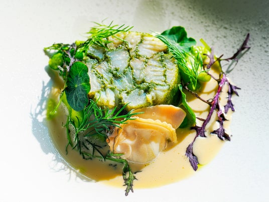 隈元シェフのシグネチャーディッシュ「サーモンのアスピック」に、みずみずしい春野菜を添えた前菜です。芽吹きの葉野菜がもたらす、青々しく清らかな香りと一緒にお楽しみください。トラウトサーモンを美しくゼリー寄せにしたこの一皿は、「第64回プロスペール・モンタニェ国際料理コンクール」優勝時に生まれた、シェフを代表する逸品です。