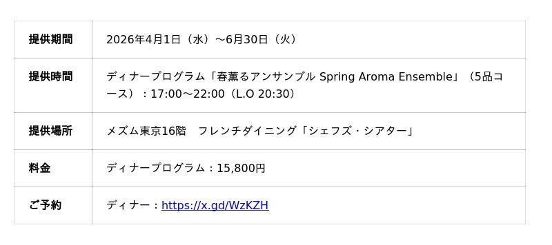 東京の躍動感や波長と共鳴し、上質な空間でクリエイティブな体験ができるモダンラグジュアリーホテル『メズム東京、オートグラフ コレクション』(港区海岸1-10-30/総支配人 生沼 久)の16階 フレンチダイニング「シェフズ・シアター」では、春の香りをテーマにしたディナープログラム「春薫るアンサンブル-Spring Aroma Ensemble」を、2026年4月1日(水)から6月30日(火)までの期間限定でご提供します。