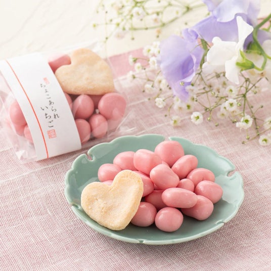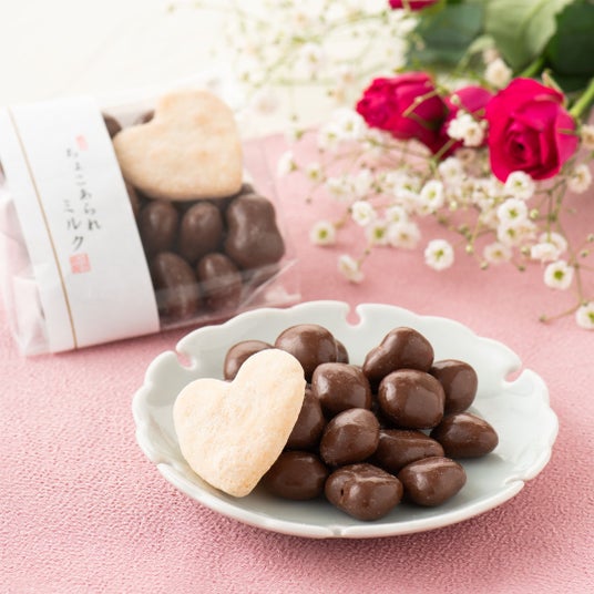 ちょっとしたギフトとしても大人気のチョコあられシリーズ。伝統製法「丸粒蒸し」で炊いた餅を職人の火加減で焼き上げた香ばしい素焼きあられに、チョコをまとわせました。1袋にひとつだけ入っている和三盆味のハート煎餅もかわいらしさを引き立てます。※店舗販売のみの商品です。