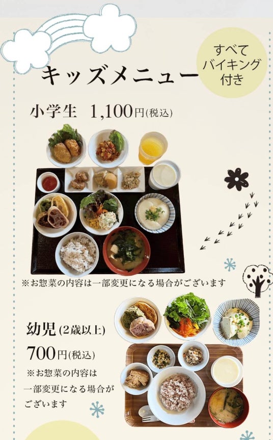 豆腐ハンバーグの「五ケ山豆腐御膳」と「グルテンフリーたっぷり野菜カレー御膳」の通年メニューもご賞味ください。ともに2,200円(税込)。キッズメニュー(小学生)1,100円(税込)と、幼児(2歳以上)700円(税込)も準備しております。