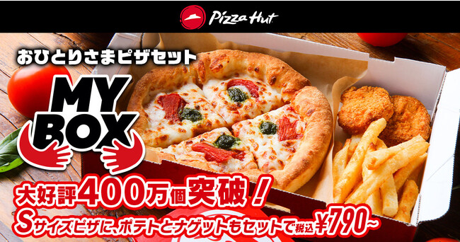 「MY BOX(マイボックス)」は、Sサイズピザにハットフライポテトとチキンナゲット2コが付いた、おひとりさま専用のピザセットになります。「ピザハット・マルゲリータ」 「ほっくりポテマヨソーセージ」「デラックス」といった人気の定番ピザ10種から選び放題!ハットフライポテトとチキンナゲット2コも加わり、おひとりさまのお腹を満たすのにピッタリのセットが、お持ち帰りで790円~と超おトク!■セット内容:該当のSサイズピザ10種から1品を選べ、ハットフライポテトとチキンナゲット2コがついてくるセット■商品価格(税込):お持ち帰り790円~990円デリバリー 1,100円~1,300円■キャンペーン期間:2023年3月6日(月)~3月26日(日)■開催店舗:一部店舗を除く全国のピザハット■注意事項:※一部店舗では実施しておりません。※ピザ生地はハンドトス限定です。※ハーフ&ハーフはできません。※トッピングの追加、マイナスはできません。※サイドメニュー(ハットフライポテト / チキンナゲット2コ)の変更はできません。※他のクーポン、割引サービスとの併用はご容赦ください。※ピザ全品デリバリー30%OFF、お持ち帰り50%OFFの対象外となります。※デリバリーでご利用の場合、店舗毎に最低注文金額を設定させていただいております。一部店舗では「マイボックス」ひとつだけでの配達はご容赦いただいております。