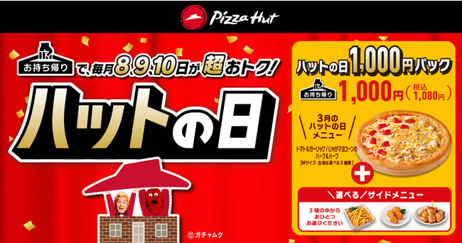 “ハット”にちなんで毎月8・9・10日は「ハットの日」!3月はMサイズの「トマト&ガーリック」と「じゃがマヨコーン」のハーフ&ハーフ+サイドメニュー1品(3品の中から1つ選べる)のパックをお持ち帰り限定で1,080円という超おトク価格で提供します。甘みのあるイタリアントマトとガーリックの風味がぴったりの「トマト&ガーリック」と、大きめにカットしたじゃがいもを使った人気のポテマヨと特製マヨソースが主役「じゃがマヨコーン」が、同時に楽しめる、おトクなピザとなっております。■セット内容:「トマト&ガーリック」と「じゃがマヨコーン」のハーフ&ハーフ+サイド1品(ハットフライポテト M / チキンナゲット S / もちっと!ハニーフォカッチャ の中から1品お選びいただけます)■商品価格(税込):1,080円■キャンペーン期間:2023年3月8日(水)~3月10日(金)■開催店舗:一部店舗を除く全国のピザハット■注意事項:※ピザはMサイズ限定、生地は「ハンドトス」「パンピザ」「クリスピー」から選べます。※他のクーポン、割引サービスとの併用はご容赦ください。※数量限定。店舗により販売を終了させていただく場合があります。※予告なく「ハットの日1,000円(税抜)パック」キャンペーンを終了させていただく場合があります。