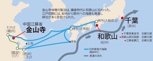 房州(千葉県)と紀州は海路による交流が盛んで一六00年代からは移住者も多くあったようです。「白浜」「勝浦」など今も残る共通の地名も見受けられ、黒潮に乗ってさまざまな文化の交流があったのではないでしょうか。金山寺みそやそのタレを使った醤油も、紀伊半島と気候風土が良く似ている房総半島でも造られるようになり、庶民の食文化として育まれて来たようです。