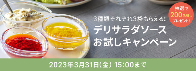 「デリサラダソース3種類セット」を抽選で200名様にプレゼントするお試しキャンペーンを3月8日(水)から実施します。